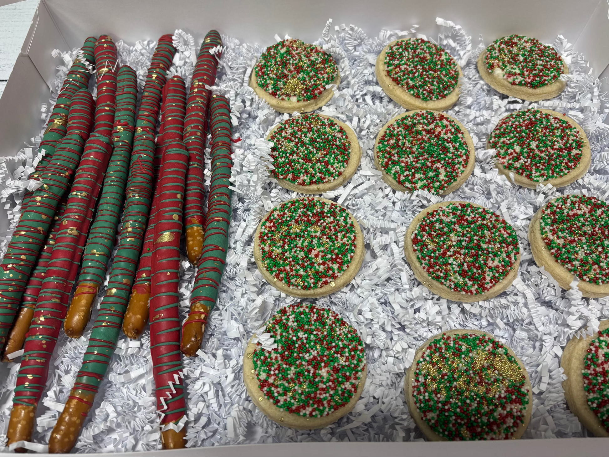 Treat bundles includes: 24 standard cupcakes, 12 mini sugar cookies with sprinkles and 12 Chocolate Dipped Pretzel rods.