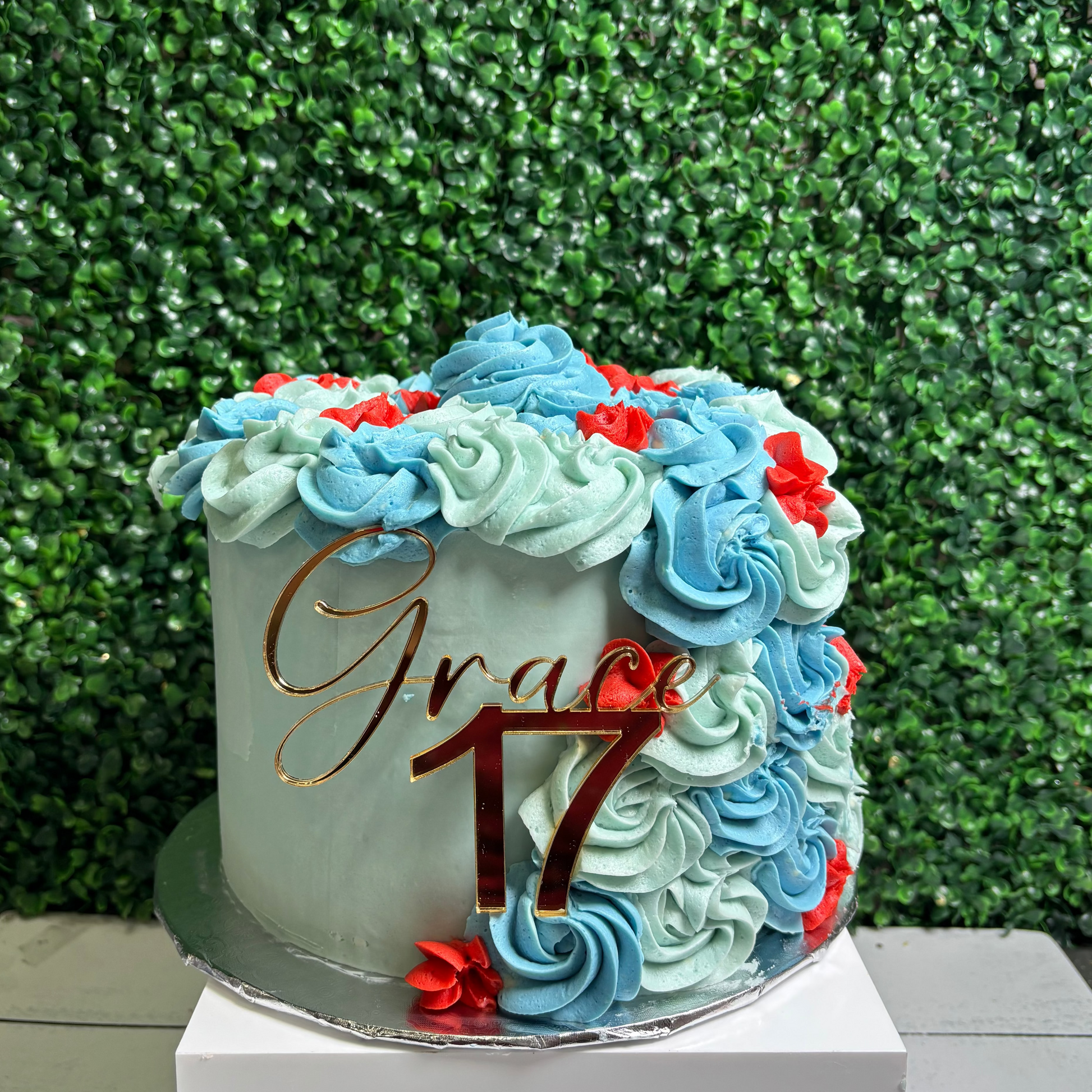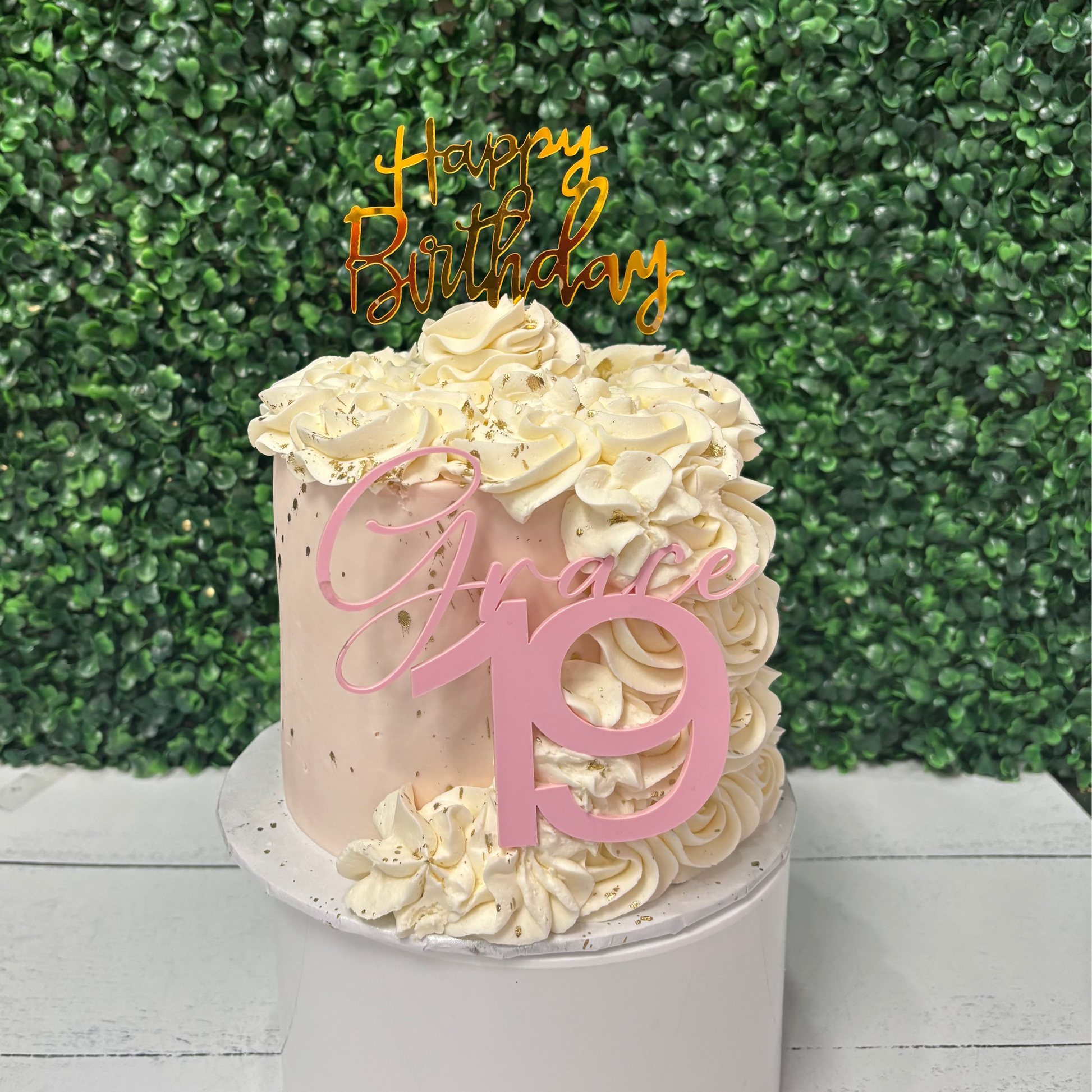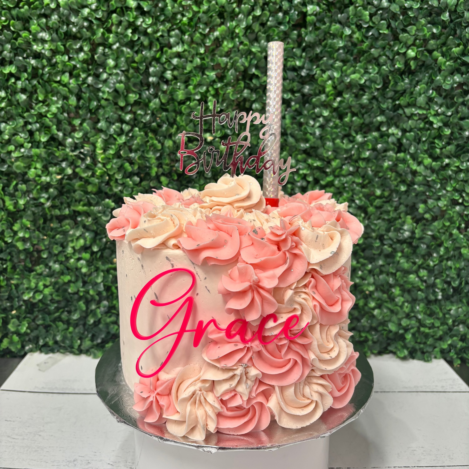 Our signature cakes come with a taste to match it's beauty. Baked with high-quality ingredients, filled with house-made buttercream and adorned with buttercream rosettes for simple elegance.
