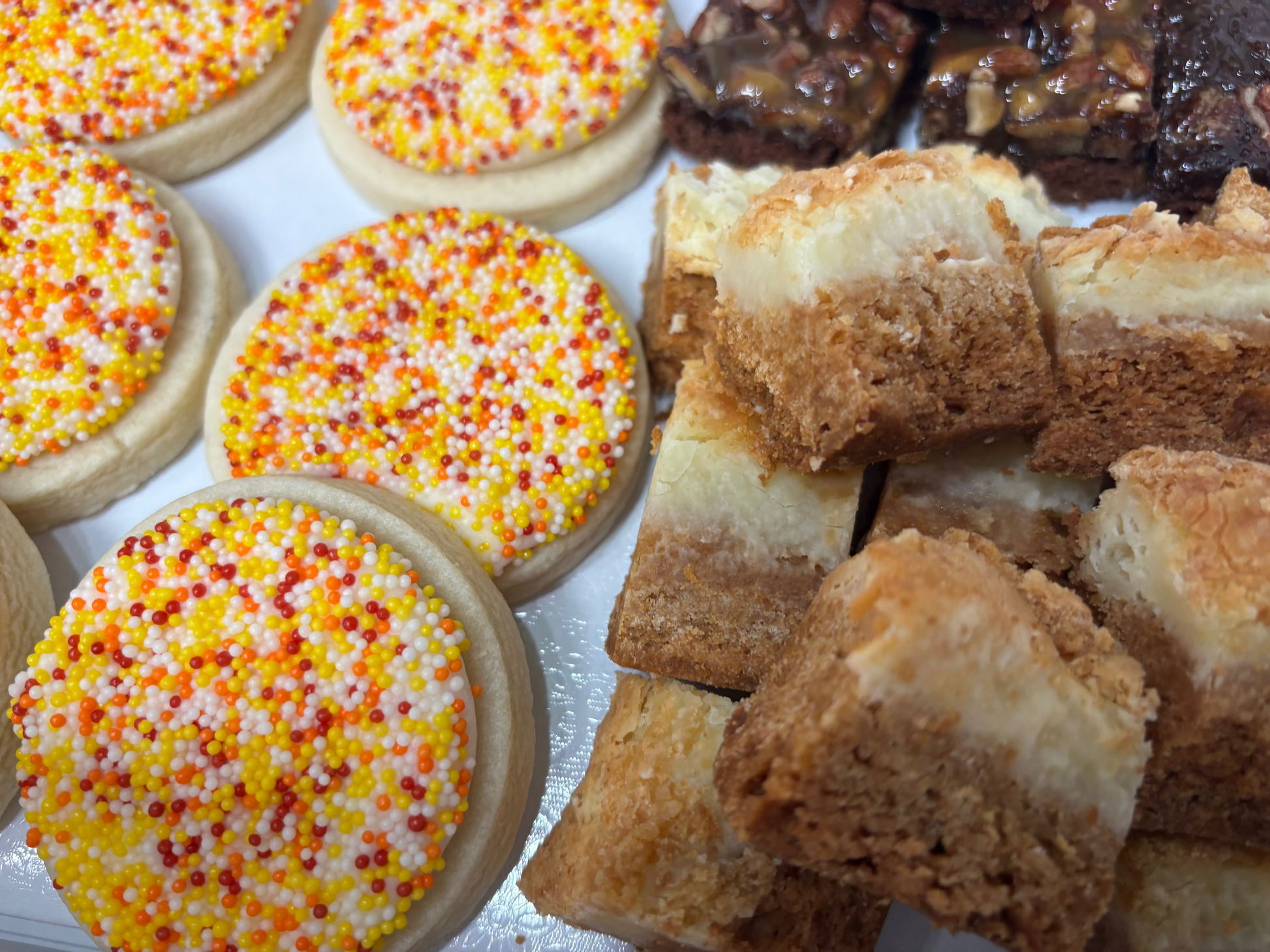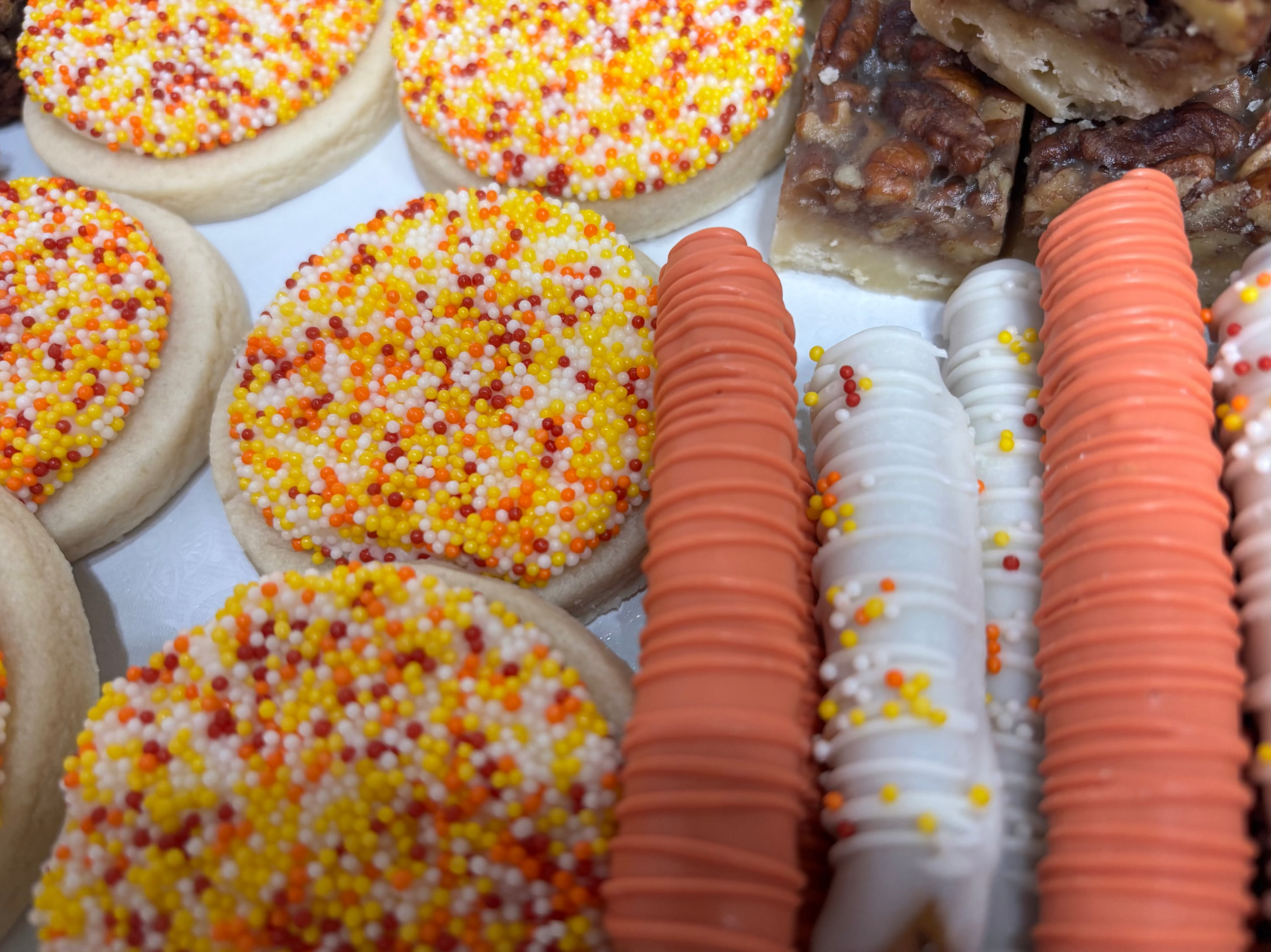 Fall Box Includes bitesized: chess squares (12), pecan bars (12), turtle brownies (12), chocolate dipped pretzel rods(12) and iced sugar cookies (8)