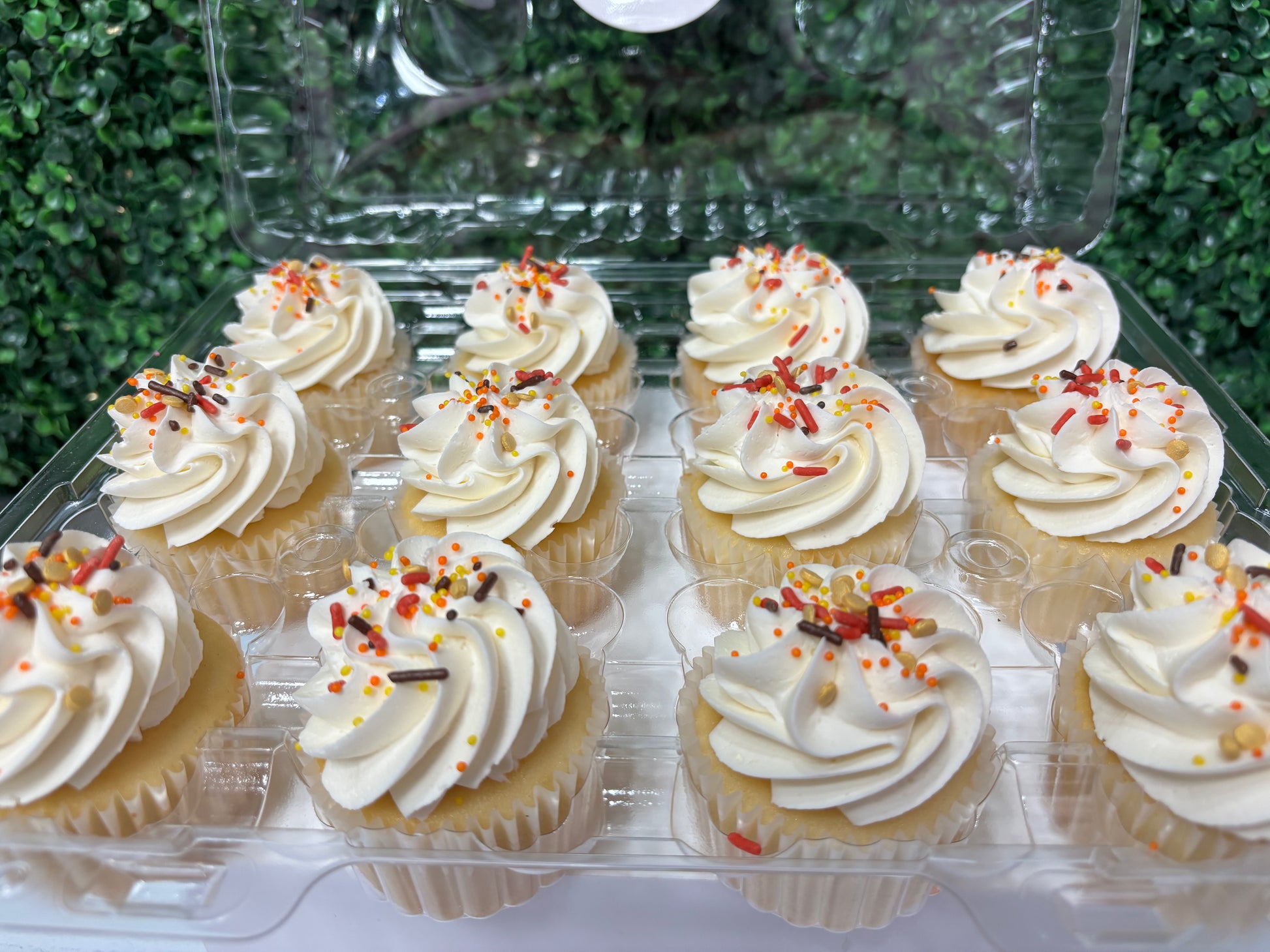 Solid color cupcakes decorated with orange buttercream icing. Color can be changed by indicating your choice of color in the notes section at checkout. **One flavor per dozen**