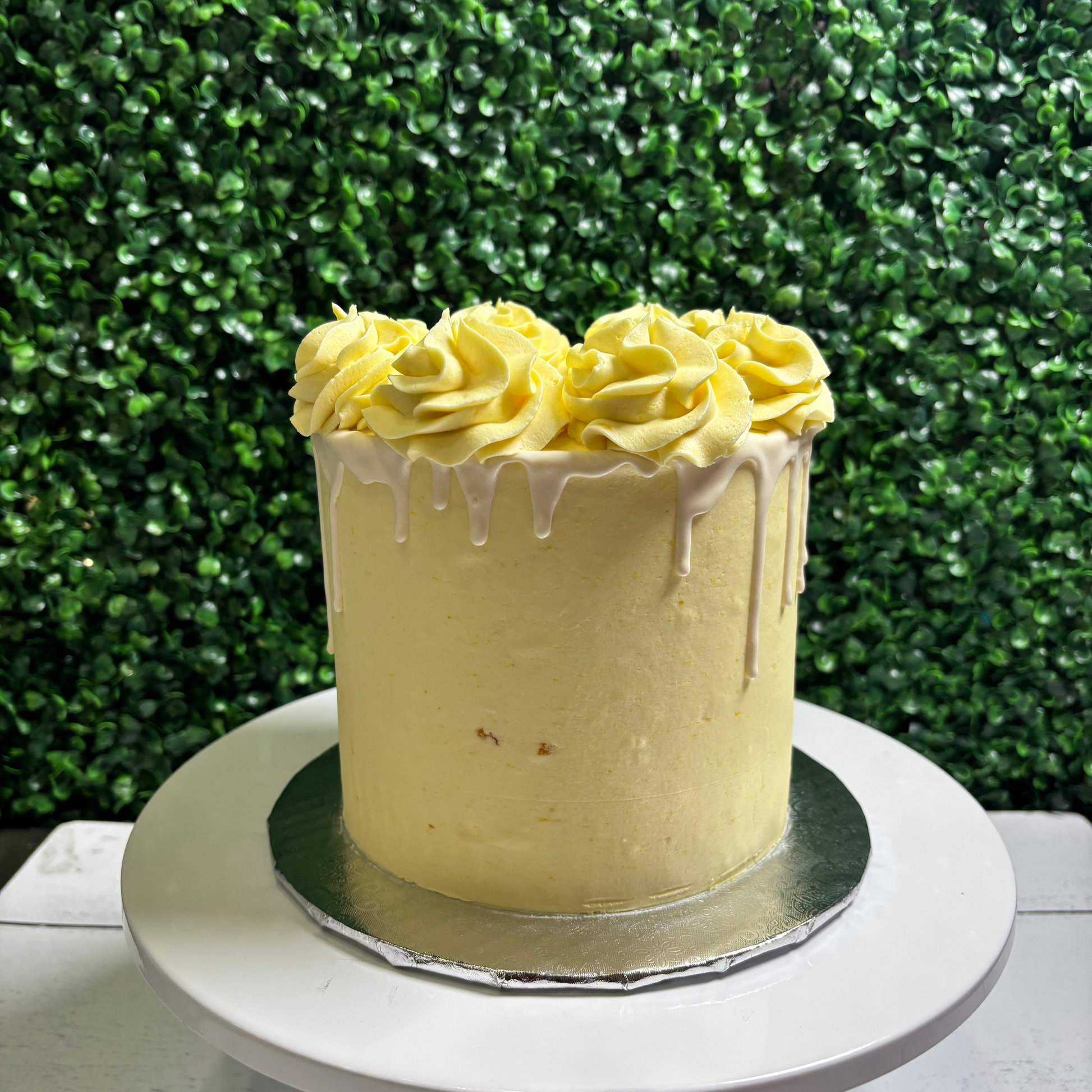 Lemon cake, iced with our classic lemon buttercream and topped with vanilla cake drip. Available in Gluten Free.