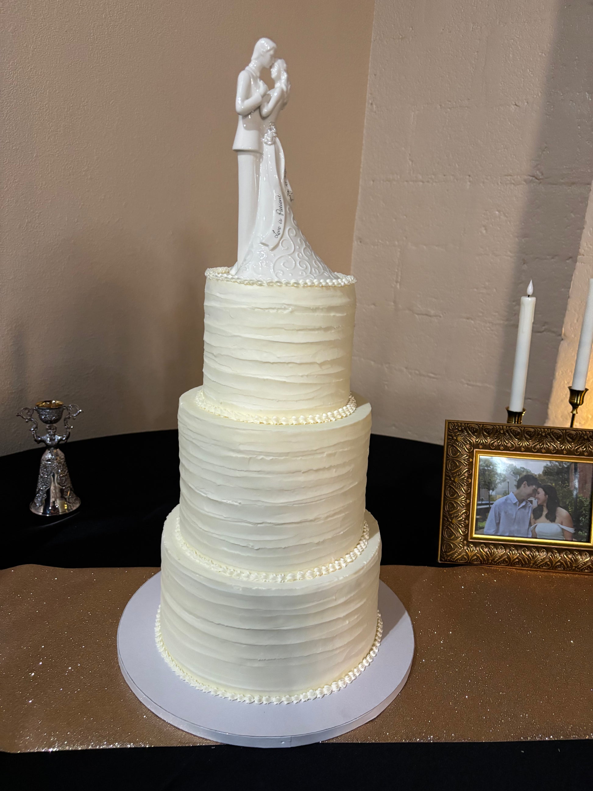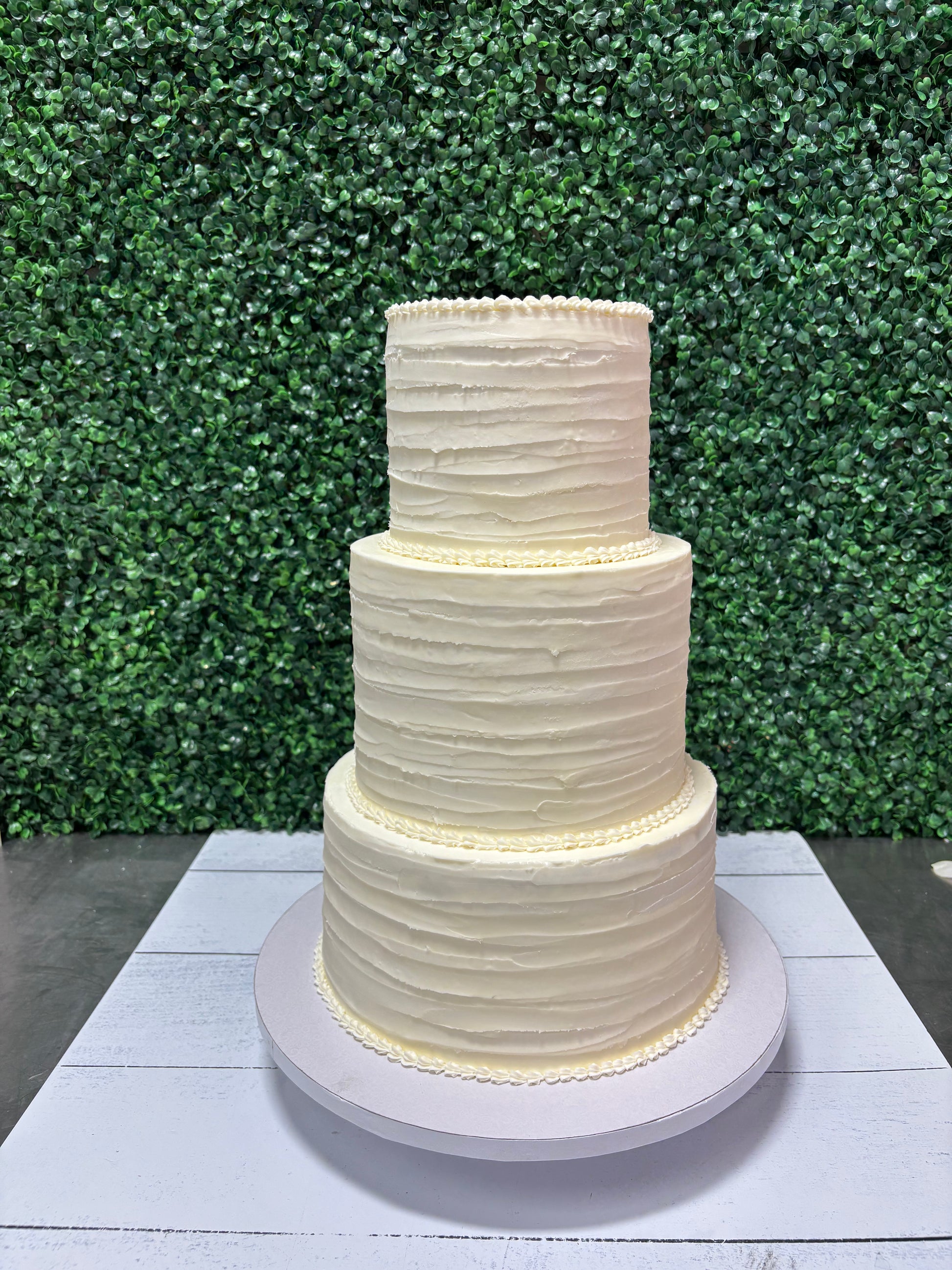 3 tier wedding cake (6,8, 10, inch tiers). Florals not inclued in price Serves approximately 65.Slices may be cut smaller to maximize servings.