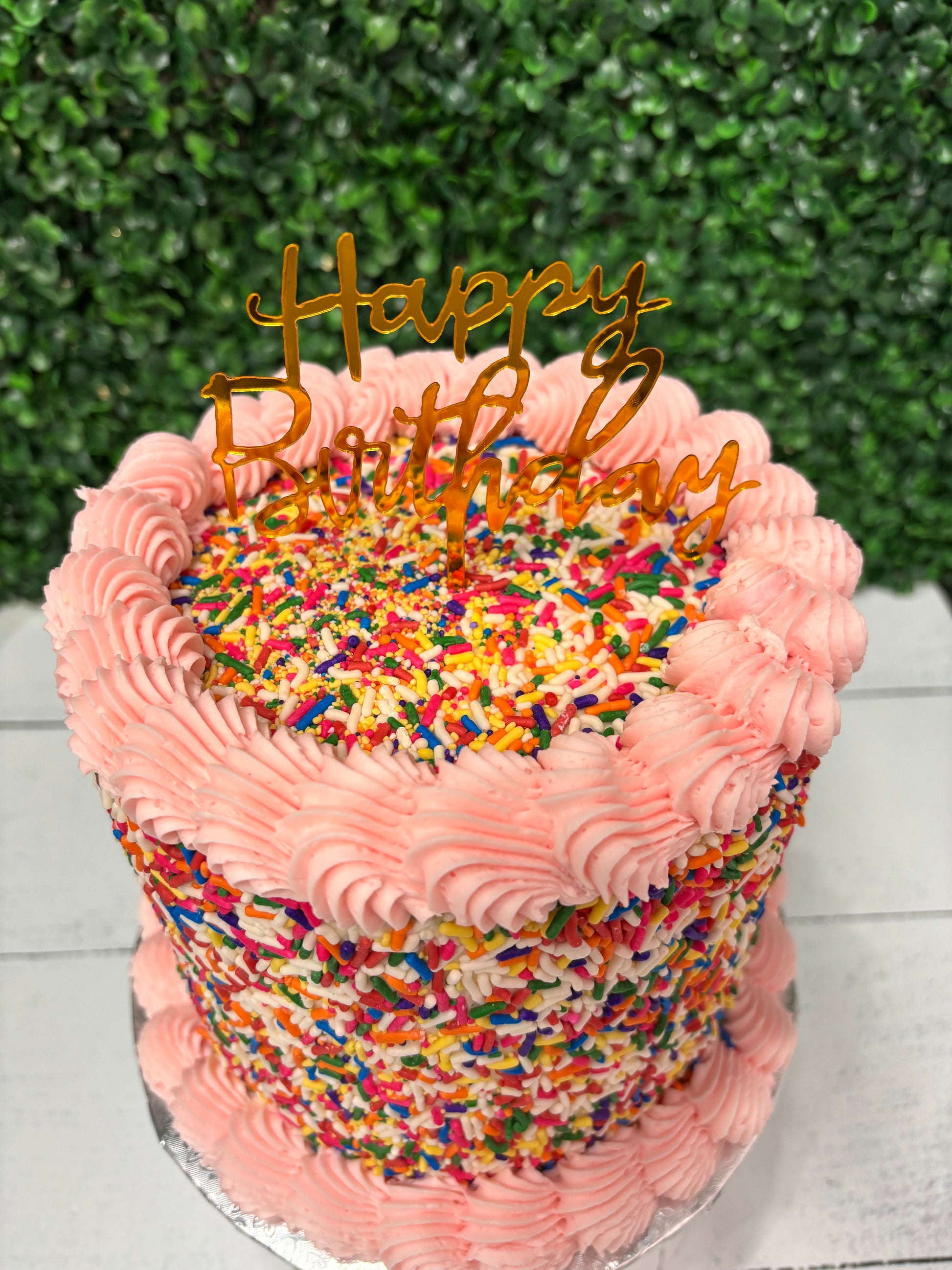 Please note, we do not write on cakes and our acrylic name plates will not stick to the sprinkles on this product.