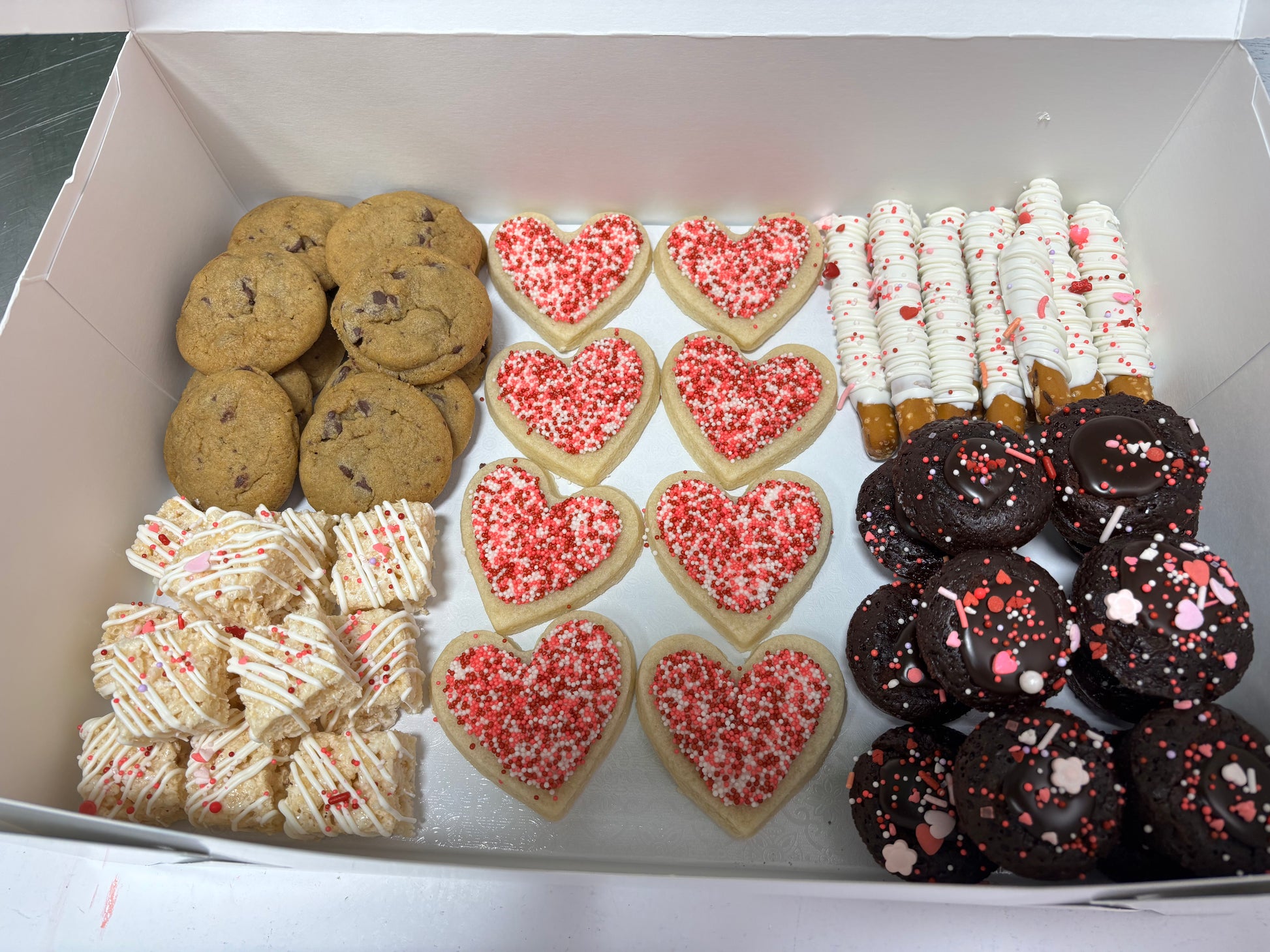 Valentine's Day Box Includes bitesized: chocolate chip cookies(12), Rice Krispies(12), fudge brownies (12), chocolate dipped pretzel rods(12) and iced sugar cookies (8)